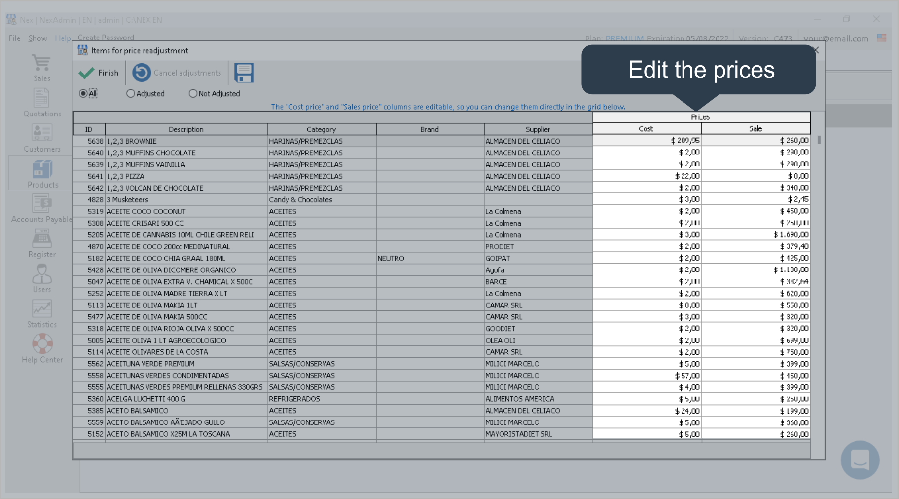 4. It is possible to APLLY FLTER in the Description, Category, Brand and Supplier columns, for a greater visualization of the products when modifying the prices.